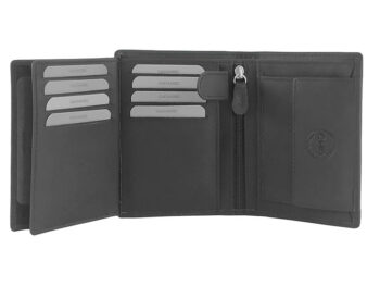 Billetero de cuero. Dispone en su interior de 14 apartados para tarjetas y DNI, uno de ellos con cierre de cremallera. Monedero exterior con cierre de cremallera.