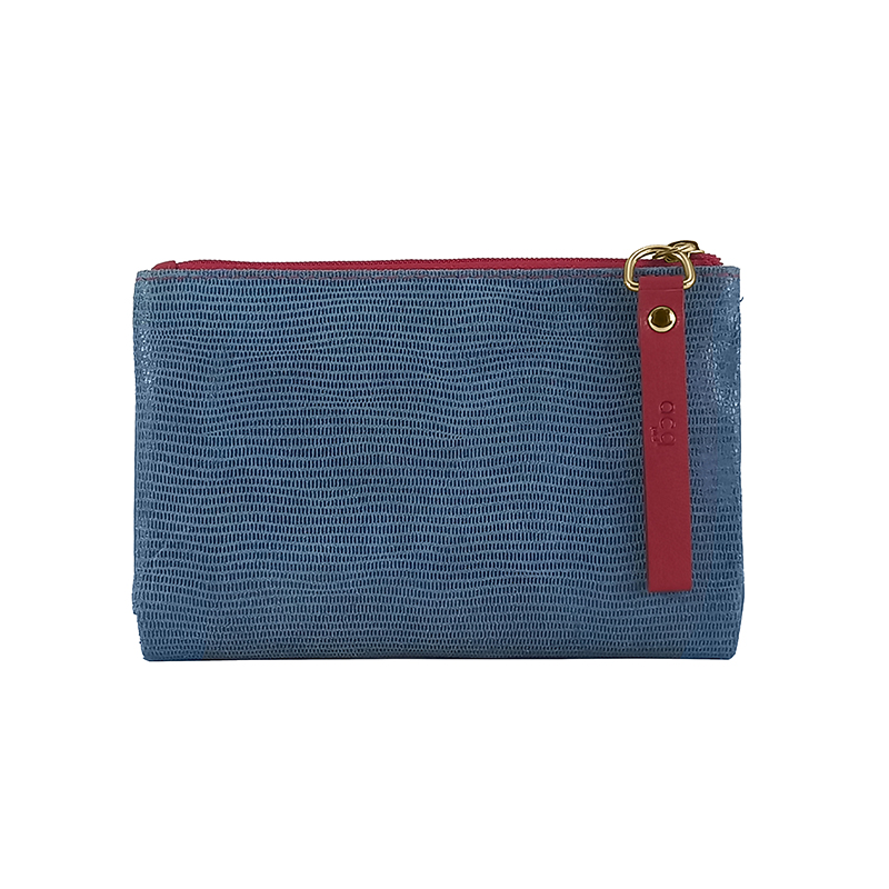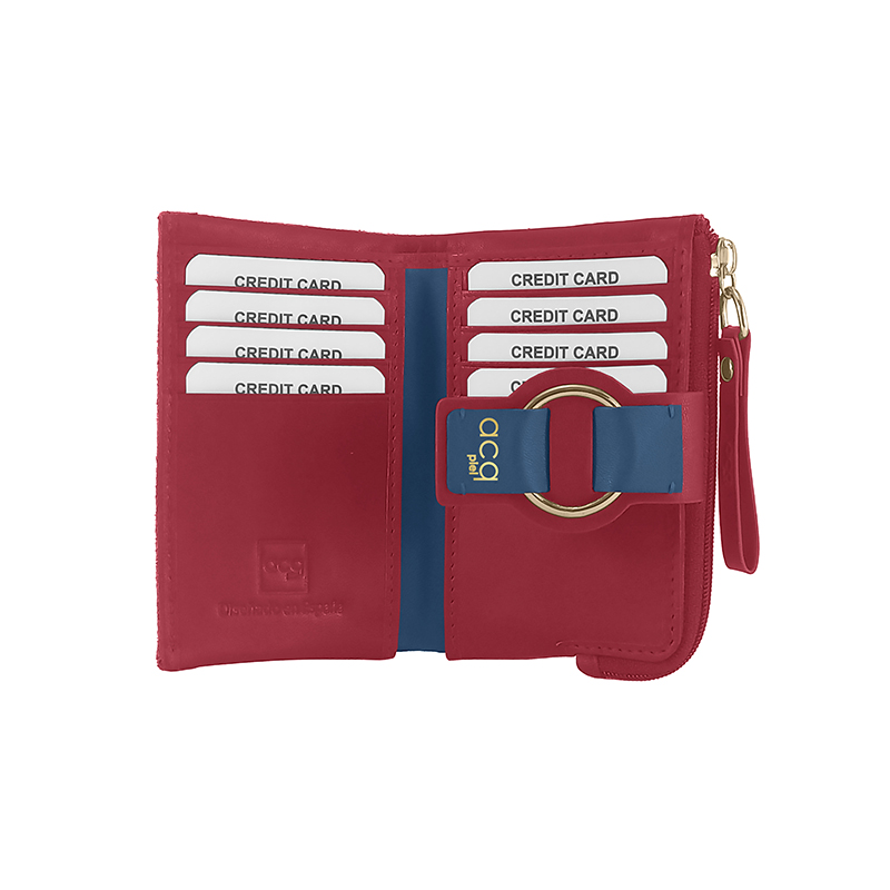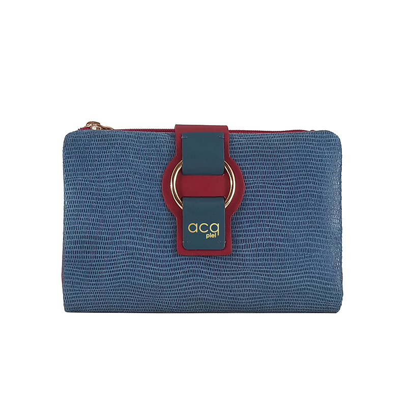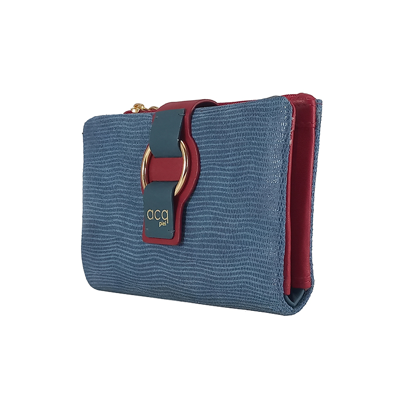 Billetera de mujer de piel con acabado tejus. Consta de 10 departamentos para tarjetas, 1 monedero con cremallera y 1 departamentos para billetes.